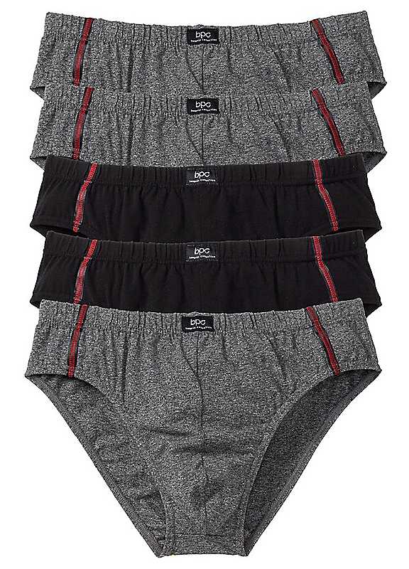 Five pairs of cotton briefs for men. 3 x Grey Marl and 2 x Black.Brand: bonprixMachine washable95% Cotton, 5% Elastane | black cotton briefs, mens black briefs, mens grey briefs, mens briefs cotton, mens underwear briefs