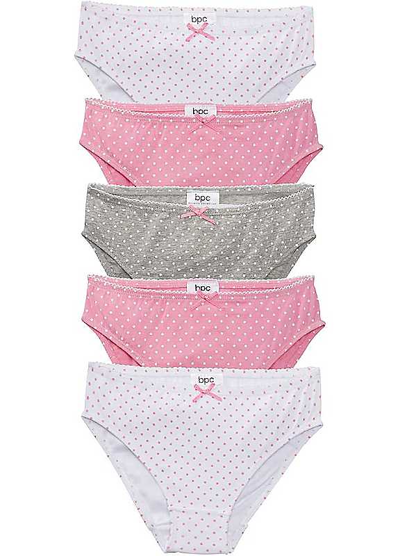 Upgrade your little one's underwear collection with our bonprix Pack of 5 Dotty Girls Briefs. Made with soft and comfortable materials, these briefs will keep your girl feeling cosy and stylish all day long. The pack includes five different dotty designs, adding a fun and playful touch to her wardrobe. Our bonprix brand is known for its quality and affordability, making this pack a must-have for every parent. Give your little fashionista the confidence to conquer the day with our bonprix Pack of 5 Dotty Girls Briefs. Brand: bonprix 95% Cotton, 5% Elastane By purchasing these products you are supporting the sustainable farming of cotton as part of the 'Cotton Made in Africa' initiative and contributing towards the improvement of living conditions for cotton farmers in Africa. | light pink underwear, soft cotton underwear, light pink panties, pack of cotton underwear, cotton underwear briefs, cotton brief panties, soft cotton panties