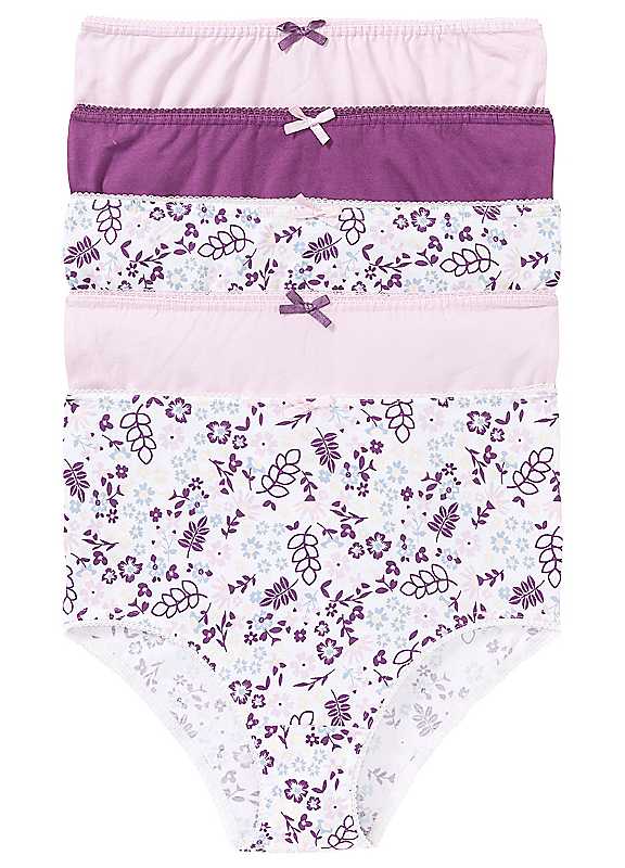 Pack of five high rise briefs in a plain and floral print design. Brand: bonprix Pack of 5 2 x White Print, 2 x Pale Pink & 1 x Lilac Washable 95% Cotton, 5% Elastane | lingerie briefs, light purple panties, high waisted cotton briefs, women's briefs, pack of cotton underwear, cotton briefs women, pink briefs