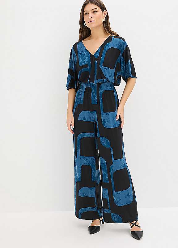 Introducing the Retro Pattern Jumpsuit by bonprix - a stylish and addition to your wardrobe. This womens jumpsuit features a flattering wrap design with a V neck and button closure, adding a touch of elegance to your day look. The eye-catching retro pattern adds a playful touch, while the three quarter sleeves and full length cut make it perfect for any occasion. Made with materials, this patterned jumpsuit not only looks good, but also does good for the. Upgrade your style game with the Retro Pattern Jumpsuit from bonprix.Brand: bonprix95% Polyester, 5% ElastanePlease Note: European sizing tends to run smaller than UK. We suggest sizing up for the perfect fit! | stylish jumpsuit,fitted jumpsuit,retro jumpsuit,patterned jumpsuit,v neck jumpsuit,black jumpsuit women,comfy jumpsuit