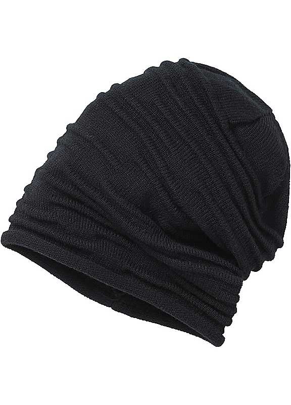 A warm knitted beanie with a casual ruched finish to keep you feeling snug this winter. One size fits all. Brand: bonprix 100% Acrylic | ladies black beanie, slouchy beanie hat, winter beanie hat