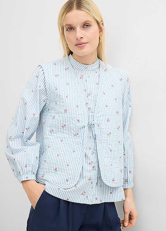 Cotton gilet in a quilted style featuring floral embroidery on a striped background. Includes a tie fastening for a secure fit. Perfect for adding a touch of femininity to your outfit. Machine washable Outer & Lining: 100% Cotton Wadding: 100% Polyester Length approx. 60 cm Please Note: European sizing tends to run smaller than UK. We suggest sizing up for the perfect fit!