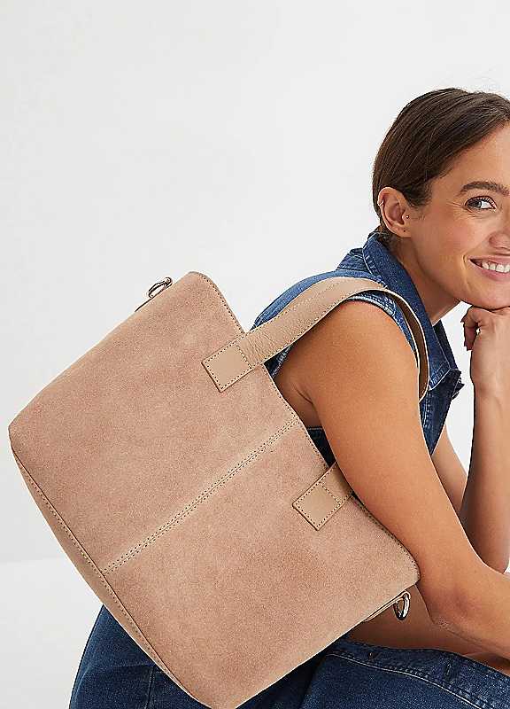 The bonprix Suede Handbag is the perfect addition to any woman's wardrobe. This spacious leather bag features both grab handles and a long shoulder strap, making it versatile and easy to carry. With a zip closure, your belongings will stay secure while on-the-go.Brand: bonprixLeatherDimensions approx. 23H x 40W x 15D cm