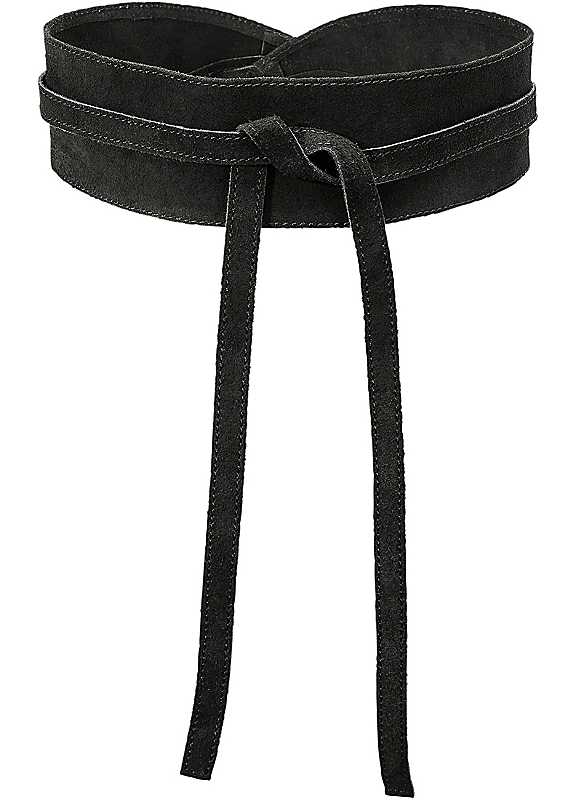 Show off your slimmest part with this chic waist belt. Adjust the fit using the slim ties at the front. Brand: bonprix Suede Leather Width approx. 7 cm (2¾ in) | black suede belt, leather waist belt, black waist belt, obi belt leather, black leather belt, thick black leather belt