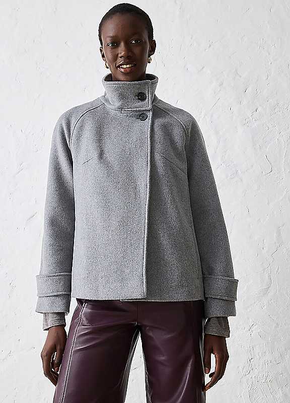 Stay warm and stylish with our Wool Mix Funnel Collar Coat, featuring a classic plain design and long length sleeves. The button closure at the high funnel collar adds a touch of elegance to this short coat, while the lining ensures easy care and comfort. This coat is a must-have in your wardrobe.Machine washableOuter: 50% Wool, 30% Recycled Polyester, 15% Polyester, 5% Other Fibres, Lining: 55% Recycled Polyester, 45% ViscoseLength approx. 66 cmPlease Note: European sizing tends to run smaller than UK. We suggest sizing up for the perfect fit!