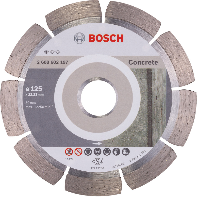 * Reliable Cuts in Concrete * Optimised diamond matrix delivers solid results * Diameter: 125mm, Bore diameter: 22.23mm, Cutting width: 1,6mm, Segment height: 10mm | Bosch Concrete Diamond Cutting Blade 125 x 22.23mm