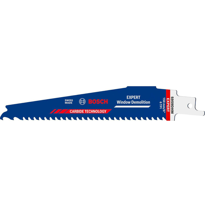 The Bosch EXPERT Window Demolition S956DHM Reciprocating Saw Blade is a firm favourite with window fitters It even withstands contact with masonry, mortar and plaster. Fits all S-shank reciprocating saws. A window demolition blade designed for the modern era. Backed by Bosch Carbide Technology, its teeth will tear through the toughest and strongest fixing screws, and survive to do it again and again. It’s tough enough to withstand contact with masonry, mortar and plaster too. This blade is a specialist for windows and doors, whether they are wood, plastic or composite. The combination of longevity and efficiency helps you get any window or door demolition job done. Fits all S-shank reciprocating saws. * Bosch Carbide Technology – for a blade life that lasts up to 50x longer * Demolition specialist – ideal for cutting out windows, doors and hinges * Cuts tough materials – gets through composite stocks and high-tensile screws * Tapered tip – designed to get into the perfect place for starting a cut | Bosch EXPERT Window Demolition Carbide Sabre Saw Blade 150 x 25 x 1.25mm in Blue | Plastic