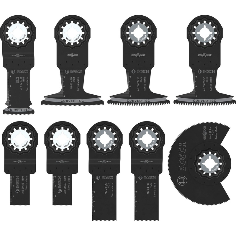 This Starlock blade set from Bosch gives you the accessories you need for plunge-cutting through a wide range of materials with your multi cutter. The pre-selected blades in this set provide you with a range of sizes for cutting both wood, metal and plasterboard. | Bosch Multi Tool Blade Set Wood/Metal (9 Piece) in Black