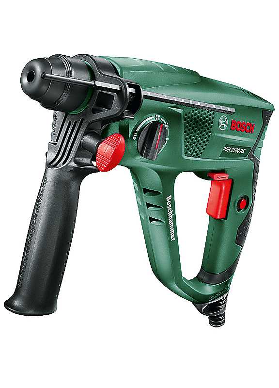 The PBH 2100 RE rotary hammer drill is ideal for general work requiring drilling, hammering, or chiselling in concrete, masonry, or tile. Compact and light, it enables comfortable overhead work and delivers a high drilling rate and a powerful chiselling performance. The PBH 2100 RE corded rotary hammer is ideal for drilling, hammering, and chiselling effortlessly in concrete, masonry, tile, wood, and metal. A 550 W motor powers the pneumatic Bosch hammer mechanism, delivering a high-impact force of 1.7 Joules. An SDS plus chuck enables quick and secure, keyless accessory changes. A Vario-Lock chisel function provides the option of 36 selectable chisel positions, ensuring the optimal working angle at all times. It also features Bosch Electronic Speed Control, which enables the correct speed for the material through the pressure-sensitive trigger.550 W motor and pneumatic hammer mechanism with 1.7 J for general applicationsSDS plus chuck for fast, keyless accessory changesHammer and chisel in concrete and masonry or drill in tile, wood, and metalChisel function with Vario-Lock providing various selectable chisel positionsDrilling up to 20/30/13 mm diameter in concrete/wood/metal, weighing only 2.2 kgPower input - 550 WPower output - 270 WNo-load speed - 0 - 2,400 rpmNo-load speed (1st gear/2nd gear) - 0 - 2,400 rpmImpact rate - 0 - 4,600 bpmSingle impact force - 1.7 JBosch hammer mechanism - PneumaticMax. drilling diameter in concrete - 20 mmMax. drilling diameter in steel - 13 mmMax. drilling diameter in wood - 30 mmWeight - 2.200 kg