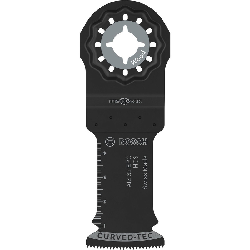 The Starlock AIZ 32 EPC blade delivers precise cuts in wood Its rounded cutting edge (Curved-Tec) allows for precise and smooth plunge cutting. Make precise plunge cuts in softwood with this Starlock multi-tool blade from Bosch. The rounded cutting edge (Curved-Tec) allows for smooth and accurate plunge cutting, ideal for tasks like cutting recesses in furniture components or flush-cutting wooden parts. The blade’s sturdy Starlock mounting system reduces wobbling, enabling more controlled cuts due to a direct power transmission from the tool to the blade. A tapered-base body minimises jamming and helps to remove material faster for a clean and efficient cut. * Precise plunge cuts in wood – ideal for softwood and furniture components * Curved-Tec rounded edge – for smooth and accurate plunge cutting * Reduced wobbling – sturdy mounting system for better control * Fast material removal – tapered design minimises jamming * Starlock mount – for optimum power transfer and fast blade changes | Bosch Starlock Wood Plunge Cut Multi-Tool Blade 32mm in Black