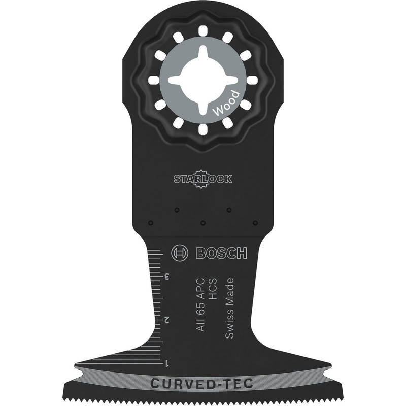The Starlock AII 65 APC blade delivers wide and precise cuts in wood Its rounded cutting edge (Curved-Tec) allows for precise and smooth plunge cutting Make wide and precise cuts in wood with the Starlock AII 65 APC blade from Bosch. Its rounded cutting edge, known as Curved-Tec, allows you to perform precise and smooth plunge cuts with ease. The blade's flat design and sturdy Starlock mounting system reduce wobbling, enabling a more controlled cut due to direct power transfer. A tapered-base body minimises jamming and removes material faster for an accurate finish. This blade is ideal for plunge cutting in softwood, such as when cutting door frames to length on the floor. * Wide and precise cuts – 65mm blade for broader cuts in wood * Curved-Tec rounded edge – for smooth and accurate plunge cutting * Reduced wobbling – flat design and sturdy mount for better control * Fast material removal – tapered body prevents jamming * Starlock mount – ensures optimum power transfer and fast blade changes | Bosch Starlock Wood Plunge Cut Multi-Tool Blade 65mm in Black
