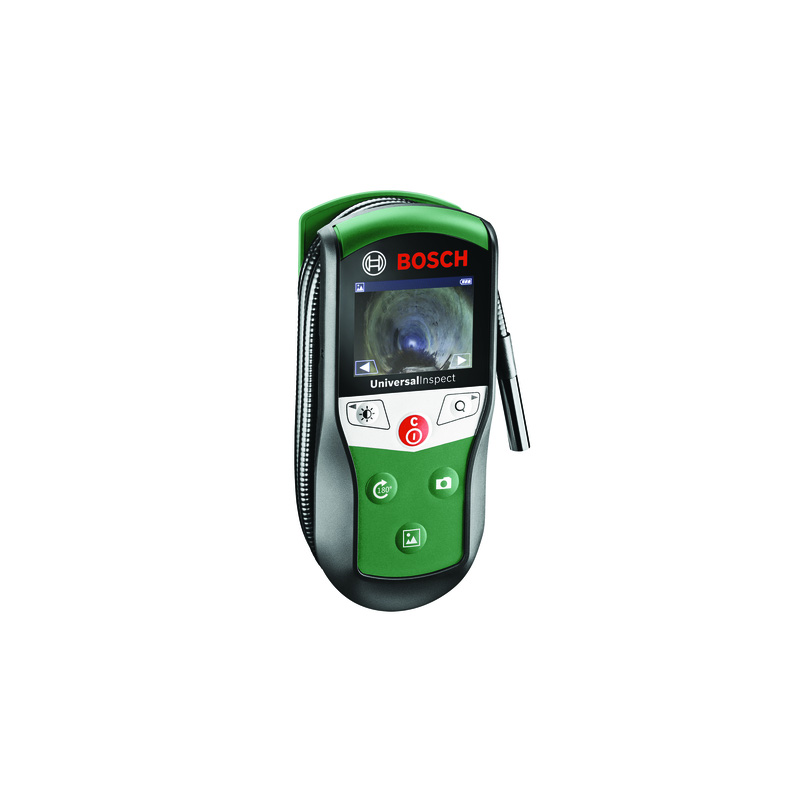 * Diameter of camera head: 8mm * Length of cable: 95cm * Display size: 2.31" * Display resolution: 320 x 240px * IP67 * Run time: 4 hours The Bosch Universal Inspect offers easy-to-use full visibility in hard-to-reach places. It provides a view into tight spaces when searching for lost items, checking pipes for blockages, detecting damage to car hoses, inspecting cavities in suspended ceilings, or to see why the washing machine will not run. Up to eight images can be stored internally or transferred via a micro-SD card. Use the digital zoom and LED illumination on the camera head to get even more clarity during use. Handy accessories like a hook, a magnet, and two brackets help to retrieve lost items. | Bosch UniversalInspect Inspection Camera