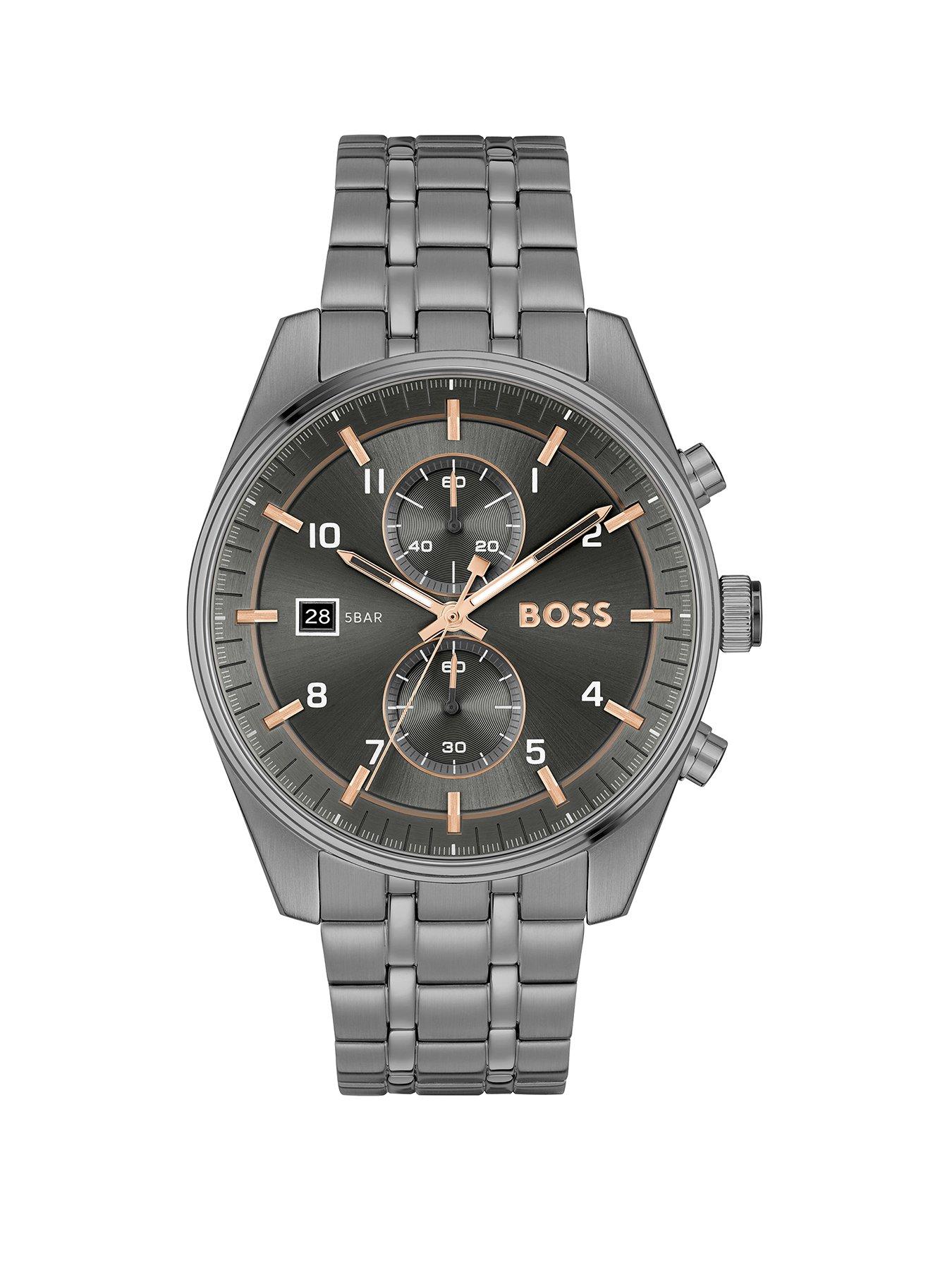 BOSS Gents BOSS Skytraveller Chronograph Grey IP Bracelet Watch BOSS gents chronograph with date window from the Skytraveller family. Featuring a 44mm grey IP case, grey dial with grey IP bracelet. Water resistant to 5 ATM. 24Hr Display: N Depth: 10.9 MM Height: 44 MM Width: 44 MM Case Diameter (in cm): 4.4 Case height (in cm): 1.1 Case Length (in cm): 4.4 Case Shape: Round Case Width (in cm): 4.4 Glass: Mineral Movement: JapaneseQuartz(battery) Water Resistant: N