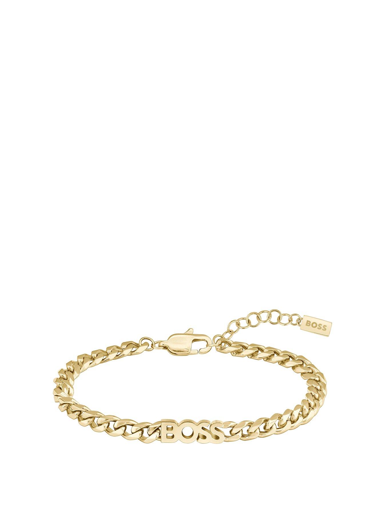 BOSS Ladies BOSS Kassy Light Gold IP Bracelet BOSS ladies bracelet from the Kassy collection. Featuring a light gold IP feminine curb chain with BOSS logo detailing with lobster clasp closure. Length 160 mm with 20 mm extender. Height: 180 MM Width: 180 MM Metal Type: Stainless Steel