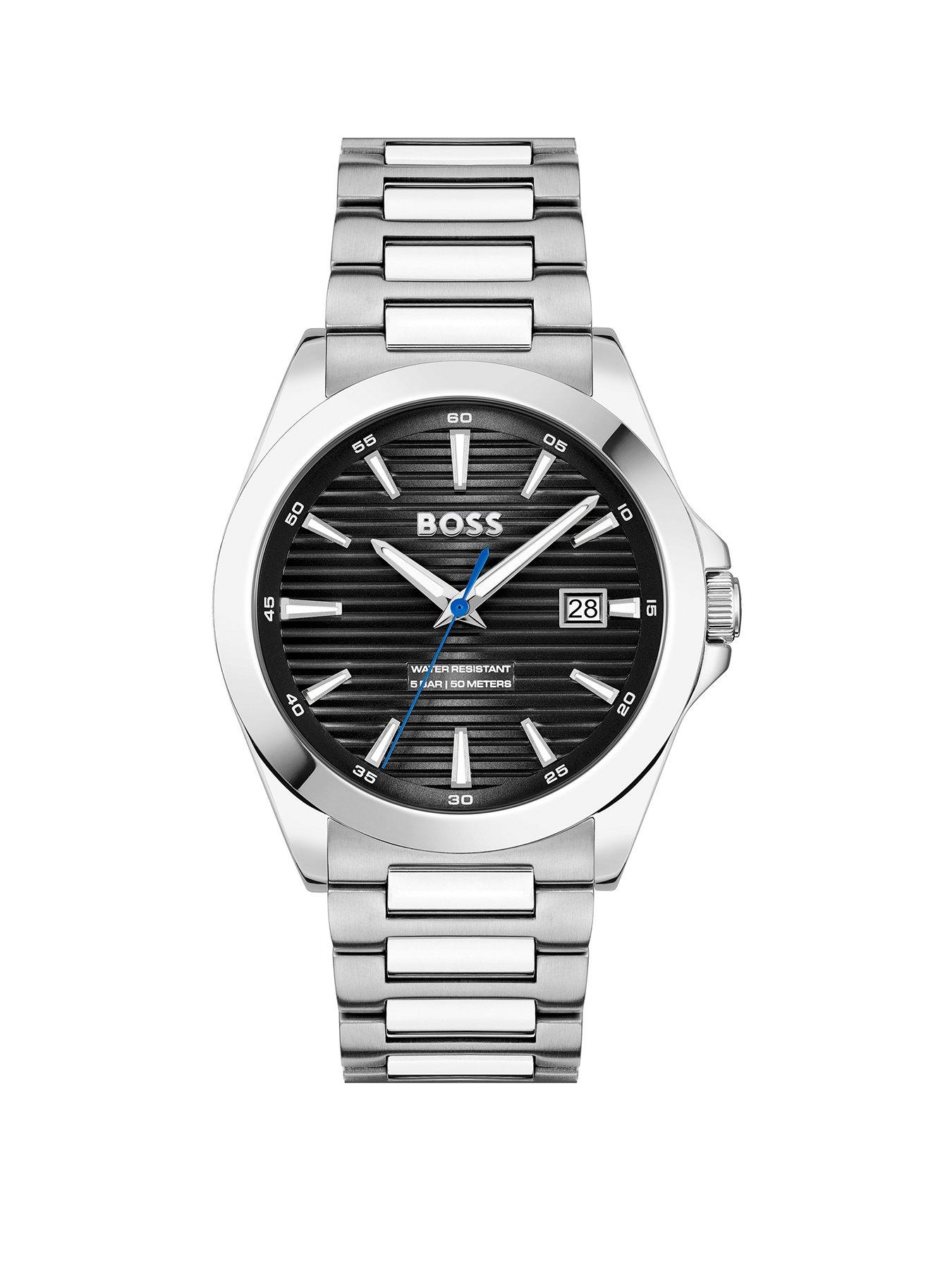 BOSS Strike BOSS gents three hand watch from the Strike family. Featuring a 41mm stainless steel case, black dial, stainless steel bracelet. Water resistant to 5ATM. 24Hr Display: N Case Diameter (in cm): 4.1 Case height (in cm): .9 Case Length (in cm): 4.1 Case Shape: Round Case Width (in cm): 4.1 Fastening Type: Bracelet Glass: Mineral Movement: JapaneseQuartz(battery) Strap Material: Stainless Steel Water Resistant: Y