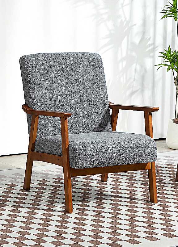 Bring a touch of Mid-Century flair into your home with this beautifully crafted accent chair. With its clean lines, retro-inspired silhouette, and soft cashmere-feel boucl© upholstery, this chair effortlessly blends form and function. Perfect for your living room, bedroom, office, or reading corner - its a stylish seat you will love to relax in. Generously padded seat and backrest ensure hours of comfort. Built to last with a solid rubberwood frame that supports up to 120 kg. Foot pads help protect your floors from scratches. Ideal as a lounge chair, bedroom chair, hallway accent, or even an office statement piece.Weight capacity: 120 kgBoucl© Fabric (100% Polyester), Rubberwood, Multi-layered Board, FoamOverall dimensions approx. 86H x 55W x 54D cmSeat thickness approx. 15 cmBackrest dimensions approx. 52L x 55W x 12D cmArmset height approx. 63 cm (floor to arm), 18 cm (seat to arm)Please remember to measure your available space before ordering. If using on an un-carpeted floor we recommend rubber or felt protection pads be used under the legs to avoid damage to your floors.