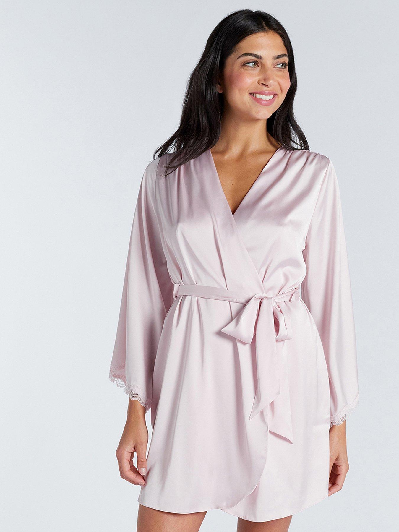 Boux Avenue Kaya Robe Size & Fit True to size - order your usual size Relaxed fit Mini length Available in sizes XS - L Details Kaya Robe by Boux Avenue Pink Wrap style satin robe 3/4 length sleeves with lace trim Tie waist belt Lightweight Material & Care Material Content: 97% Polyester 3% Elastane Washing Instructions: Machine Washable