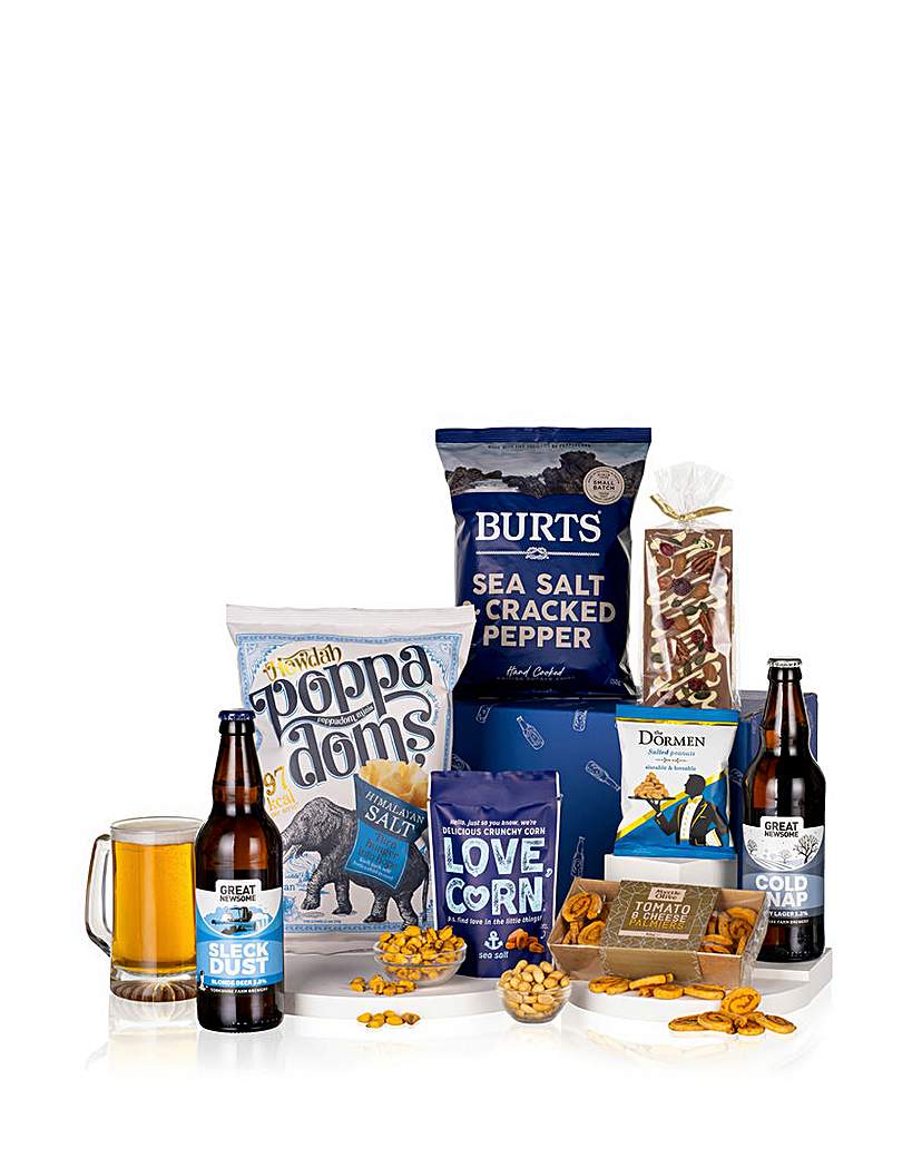Set the scene for the ultimate night in with our Boy's Night In Hamper - a bold and flavour-packed collection designed for laid-back evenings and good vibes. Whether it's game night, movie marathons or simply unwinding solo, this hamper delivers everything needed for a proper evening of indulgence. Kick off with a crisp and refreshing brew from Great Newsome Brewery - enjoy both the Cold Snap Hoppy Lager and the smooth Sleck Dust Blonde Beer, perfect for raising a glass to some well-earned downtime. Snack smart with a moreish mix of savoury delights, starting with Burts British Hand Cooked Potato Chips in Sea Salt & Crushed Peppercorns and the satisfyingly crunchy Love Corn Sea Salt Crunchy Corn. Add in Howdah Himalayan Salt Poppadom Minis and The Dormen Salted Peanuts for that full-bodied flavour punch. Elevate the snack table with Myrtle & Olive's Tomato & Cheese Palmiers - a flaky, cheesy bite with a gourmet twist. Great for creating a special moment for someone you care about. Includes: Burts British Hand Cooked Potato Chips Sea Salt & Crushed Peppercorns 150g. Howdah Himalayan Salt Poppadom Mini 80g. Love Corn Sea Salt Crunchy Corn 45g. Myrtle & Olive Tomato & Cheese Palmiers 75g. Stas Decorated Milk Chocolate 100g. The Dormen Salted Peanuts 50g. Great Newsome Cold Snap Hoppy Lager 500ml 5.2% vol. Great Newsome Sleck Dust Blonde Beer 500ml 3.8% vol. Decorative Postal Carton. You must be over 18 to purchase this product. To confirm the recipient is over 18 years old, valid photographic ID with a date of birth may be required upon delivery. Please note we are unable to deliver this item ROI or Northern Ireland.