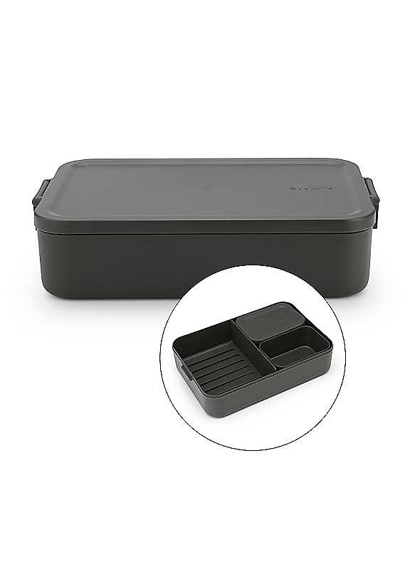 Into variation? Say no to single use plastics and switch to reusable lunch packaging with this Brabantia Make & Take Bento Lunch Box Large. Pack your sandwiches, wraps or bread rolls with ease or add the two separate containers for fruit, nuts or veggies. Your lunch, your choice. Enjoy! Bring your own - on-the-go lunch box.Roomy - L volume (2L)Separated storage - bento design with divider &/or 2 containersLocked tight - lid with clipsHandy - divider doubles as lifting trayEasy to clean - dishwasher safeMultifunctional - for microwave & freezerDurable - made of long-lasting materialsProblem-free use - 5 year guarantee & serviceConscious choice - BPA-freeMore sustainable choice - 100% recyclable after useLess waste - reusable lunch packagingMicrowave safeFreezer safeDishwasher safePlasticSize approx. 6.2 x 25.5 x 16.7 cm