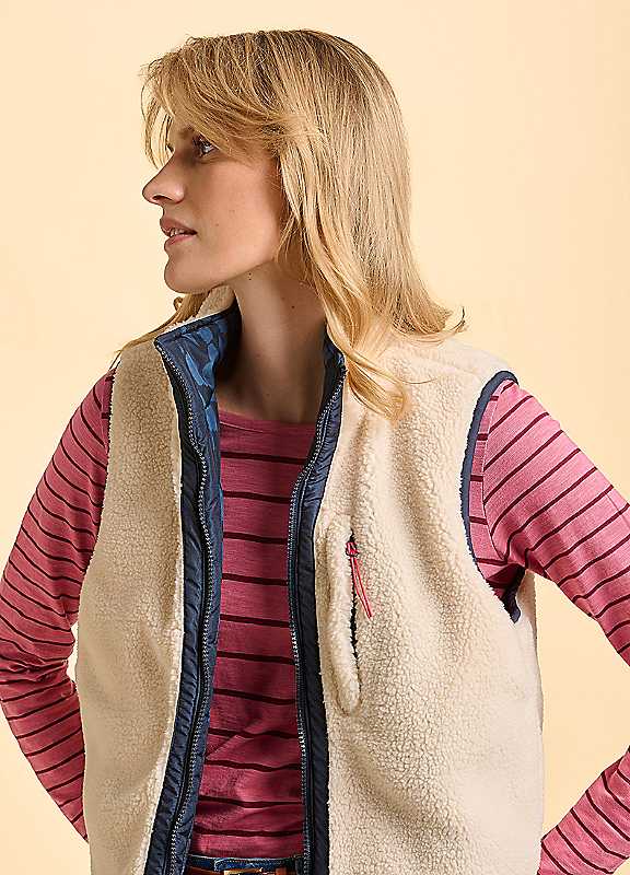 Meet your new wardrobe hero: the reversible Frosty Gilet. One side features cosy faux sheepskin, while the other shows off a padded blue brushstroke print with bright coral accents. With zip pockets on both sides and a curved hem, this versatile jacket will see you through countless outfit changes.Cold delicate washWash inside outDo not ironDo not tumble dryHang dryOuter, Lining & Padding: 100% Polyester | sheepskin jacket womens, lightweight fall jacket, lightweight winter jacket, polyester jacket women, cream sweater vest, cream shearling jacket, warm fall jacket, thin fleece jacket, polyester winter jacket, casual winter jacket, business casual winter jacket, womens casual fall jacket, cream fleece jacket, winter thin jacket, faux sheepskin jacket, fall winter jackets, winter vest jacket, fleece vest jacket, reversible fleece jacket, casual fall jacket