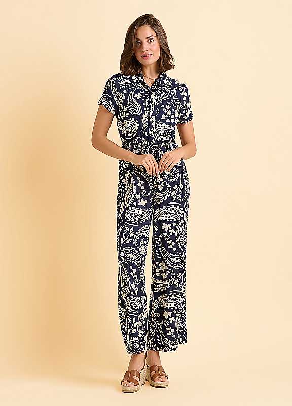 Bold and comfy, the ultimate combo for a fun day out. This printed jumpsuit features a large paisley print, a soft-edged collar with broderie trim, and a hidden drawstring at the elasticated waist. Floaty wide legs create a relaxed fit that flatters every shape. Style with your favourite sandals for daytime ease.Cold wash separatelyHang dryDo not tumble dryWarm ironIron on reverse100% Viscose | short sleeve jumpsuit, wide leg jumpsuit, beige women's jumpsuit, boho jumpsuit