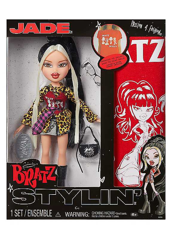 The Bratz are back with new STYLIN' looks, but this time they want to share their fashion passion with you! This Bratz doll comes with a matching shirt for you to customize. Individual fashions, matching passions!Jade customized her graphic tee by turning it into a cropped tank and layering it over a leopard print button up. Paired with a skirt, boots, a matching handbag, and charmed-up glasses. Her hair is long with a blonde money piece and her look is giving soft glam with bleached brows.SHARIN' THE FASHION: Comes with a graphic tee for you to wearAge suitability: 6+ yearsSTYLE YOUR SHIRT: Crop it, cut it, & make it yours - this exclusive oversized Stylin' graphic tee is made to match your style & your doll'sACCESSORIZE: Matching accessories to enhance the lookINCLUDES: 1 BratzĀ® Styling' Doll, 1 Cami tee, 1 button up, 1 skirt, 1 purse, 1 pair of glasses, & 1 brush - plus an adult XL graphic tee for you to customize & match your dollWarning! Small Parts. Choking Hazard. Not suitable for children under 3 years.
