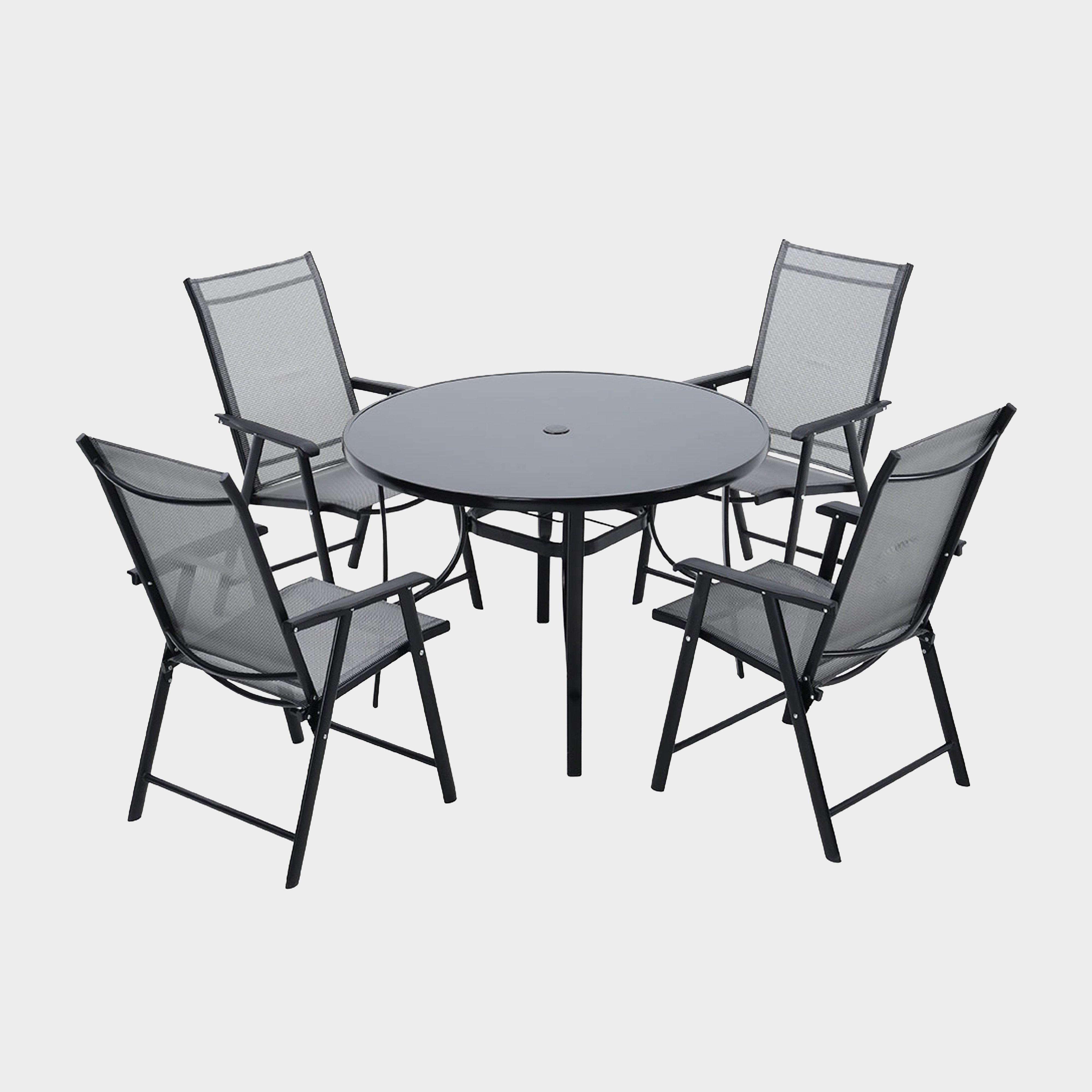 This garden table is inspired by traditional wrought-iron furniture, bringing a romantic touch to your outdoor space. The stylish black appearance and simple, chic design make it suitable for any garden or terrace. The table is crafted with a practical top for long-term use and includes a parasol hole in the center, allowing use on sunny or rainy days. Four foldable chairs accompany the table, made of fabric and metal to provide comfortable support and breathability. Perfect for gardens, patios, courtyards, cafes, or diners. Table Dimensions: 105cm Dia x 70.5cm H Max Load: 70kg Shape: Round Frame Material: Metal Tabletop Material: Tempered Glass Usage: Outdoor Parasol Hole Diameter: 51mm Foldable: No Chair Dimensions: 95cm H x 66cm W x 59cm D Frame Material: Metal Seat/Back Material: FabricUsage: Outdoor Foldable: Yes Weight Capacity: 150kg Package Content: 1 x Table 4 x Chairs Package Specifications: Carton A: 107 x 107 x 6cm, 17kg Carton B: 90 x 60 x 47cm, 18.6kg Notice & Maintenance: -Avoid long-term exposure to direct sunlight to prevent tempered glass from cracking. -Use a glass cleaner and microfiber or cotton cloth for a streak-free surface. -Allow legs and hardware to dry thoroughly before storing. -Apply a small amount of lubricating oil to joints if needed.