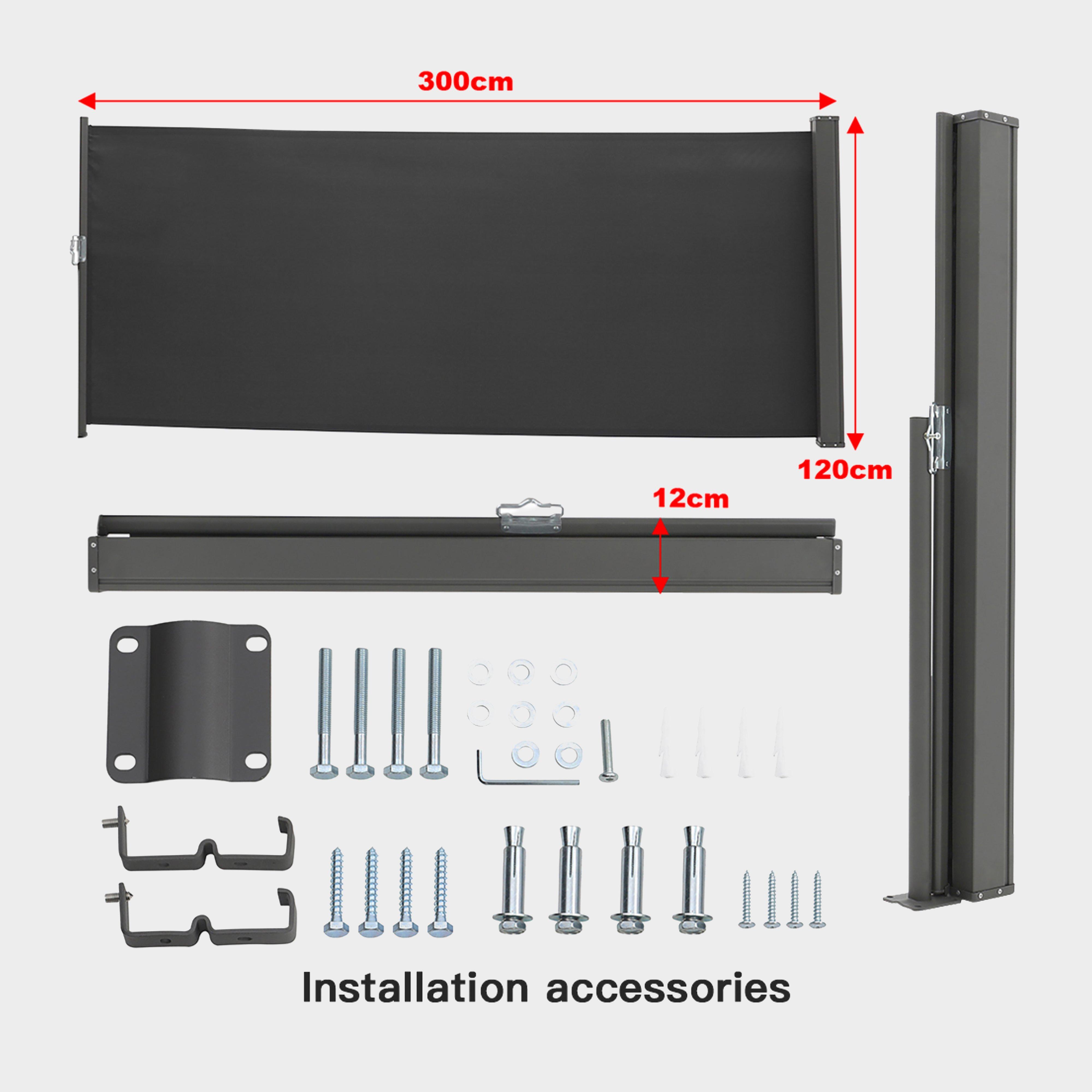 Enhance your outdoor privacy with the Livingandhome retractable patio side awning. Perfect for balconies, patios, and gardens, it shields your space from prying eyes while offering protection against mild wind, rain, UV rays, and sunlight. Constructed with a durable aluminum alloy frame and steel support pole, this awning is built to withstand outdoor conditions. Easily retractable, it can be rolled back when not in use, saving space and providing a clean, tidy look.Item Length: 300 cm Item Width: 100 cm(M);120cm(L);140cm(XL) Holder Size: 7.5 cm H x 3 cm W Material: Fabric, Steel, Aluminum Type: Balcony Screen Package Content 1 x Retractable Side Awning 1 x Installation Kit 1 x User Manual Package Specifications Dimensions (WxDxH): 107 x 17 x 11 cm(M);127 x 17 x 11cm(L);147 x 17 x 11cm(XL) Gross Weight: 10.2 kg(M);11kg(L);11.9kg(XL)
