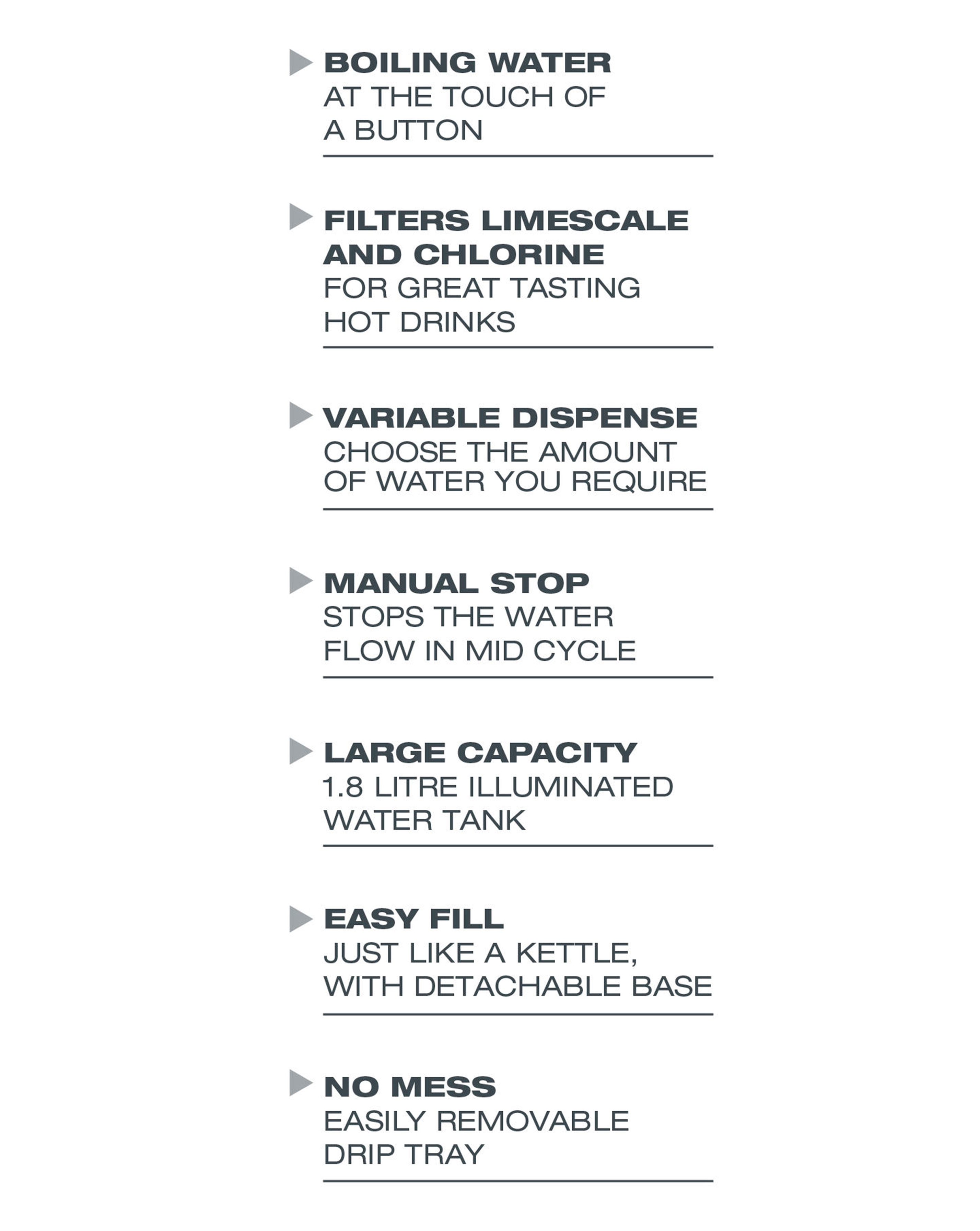 Breville Brita Filer Hot Cup. Boiling water at the touch of a button with the Breville Filter Hot Cup. Features variable dispense control for different cup sizes and stop function for control. The Filter Hot Cup features a removable drip tray for easy maintenance and built-in anti-scale filter. The easy-fill illuminated water reservoir holds up to two litres. Only boil what you need with this clever boiling system from Breville which helps you save energy. With BRITA filter technology, filters limescale and chlorine while boiling. Includes free BRITA Maxtra cartridge.