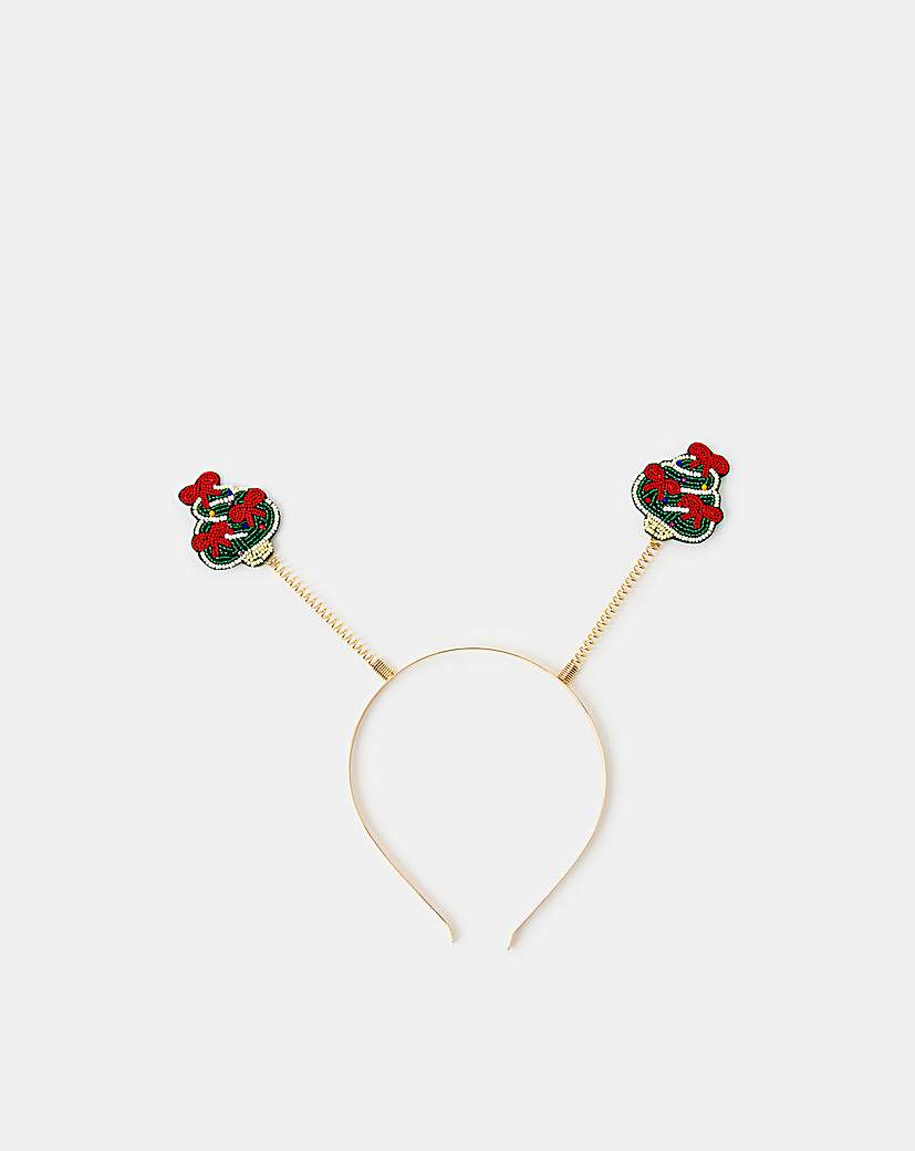 Christmas Tree Bopper Headband An fun-damental essential for festive dinners and Christmas parties, this head bopper features bow-tiful beaded Christmas tree antennae's on a gold-tone headband. Composite: Glass 10% , Iron 85% , Polyurethane (Pu) 5%