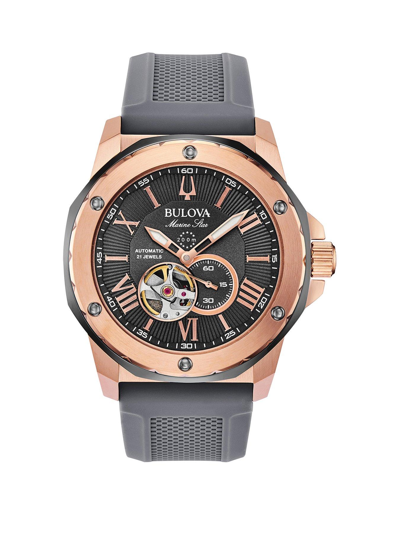 Bulova Men's Marine Star Watch - for the bold. Discover the men's Marine Star -featuring a 3-hand automatic movement showcased in an open aperture. A rose gold-tone stainless steel case with grey outer ring offers a nautical-inspired look. The grey dial is paired with a grey textured silicone strap with a contrasting red underside, while the 200m water resistance makes it perfect for the man with a sense of adventure. Bulova is driven by the same core principles of craftsmanship, innovation and technology that guided their visionary founder over 140 years ago. Much like Joseph Bulova himself, they continue to set our own impossibly high standards and create their own rules - breaking boundaries and making history to deliver exceptional results. 24Hr Display: N Water Resistant: N