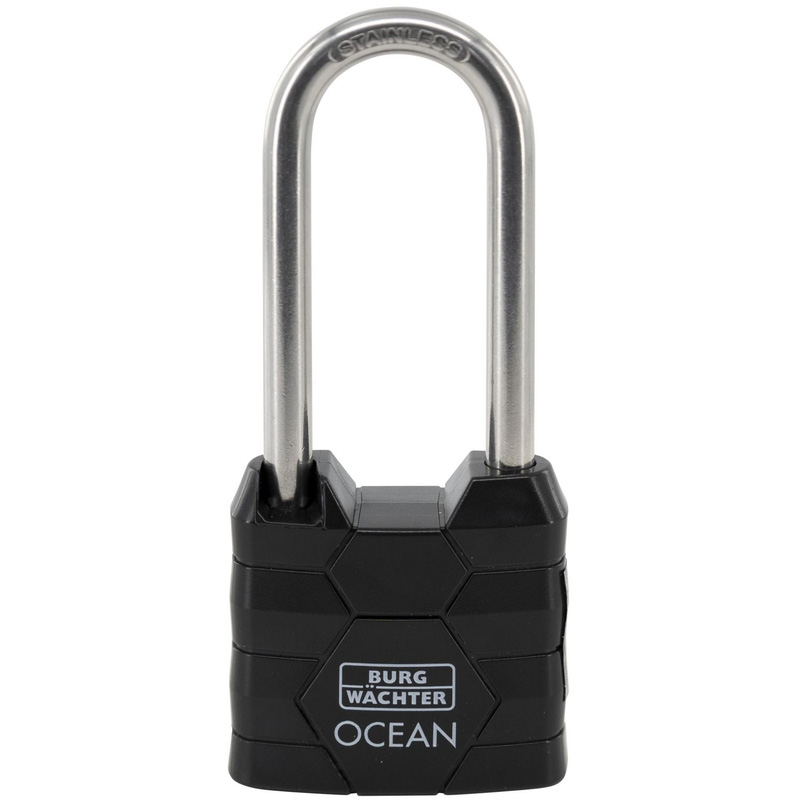 This long shackle brass padlock from Burg-Wächter is specifically designed for outdoor use in coastal or marine settings. A saltwater and rustproof option, it comes with a double-bolted stainless steel shackle and protective plastic cover made from 70% recycled plastic. * 65mm long shackle – perfect for securing larger items * 40mm body width – made from high-quality solid brass * For coastal areas – saltwater and rustproof protection * Stainless steel shackle – double-bolted for extra security * Plastic cover – impact, shock and scratch resistance | Burg-Wachter Burg-Wächter Long Shackle Ocean, Saltwater & Rustproof Padlock 40 x 65mm in Black | Plastic