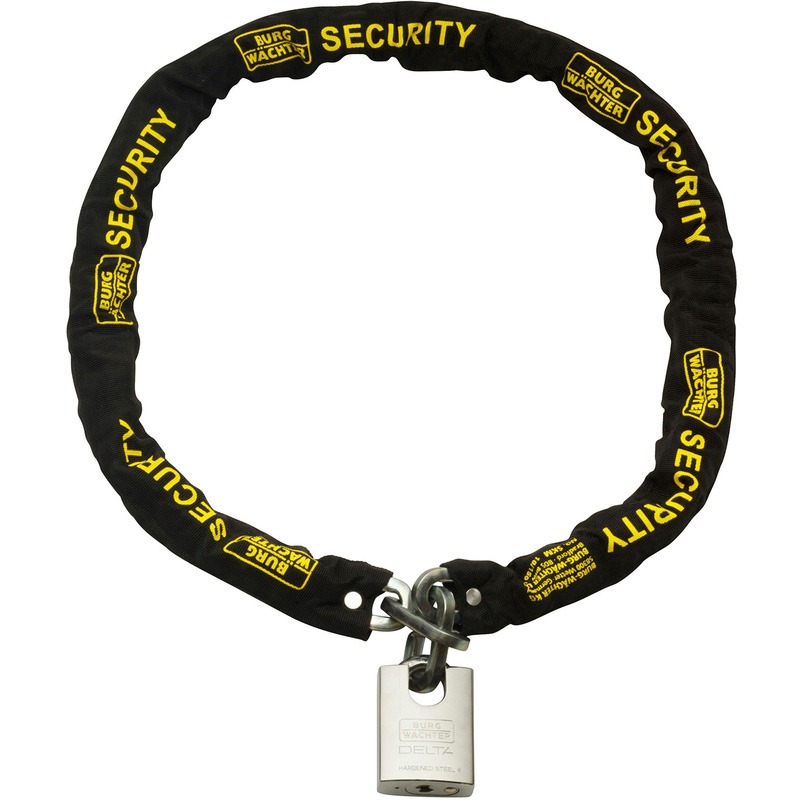 * The heavy duty padlock has a brass body and hardened steel armour for extra strength * Anti-drill cylinder to prevent attack * Stainless steel springs for corrosion protection bolt cropper resistant * Sleeving is riveted at each end for extra defence This kit also includes two heavy duty chains, rated diamond for cycles and gold for motorcycles by Sold Secure. These chains are specially designed to be hacksaw and bolt cropper resistant as they are made from high quality, case hardened steel. The riveted sleeving not only protects your motorbike or bicycle from scratches but also adds an extra layer of defence against attackers. | Burg-Wachter Heavy Duty Chain & Heavy Duty Padlock 1.5m | Steel