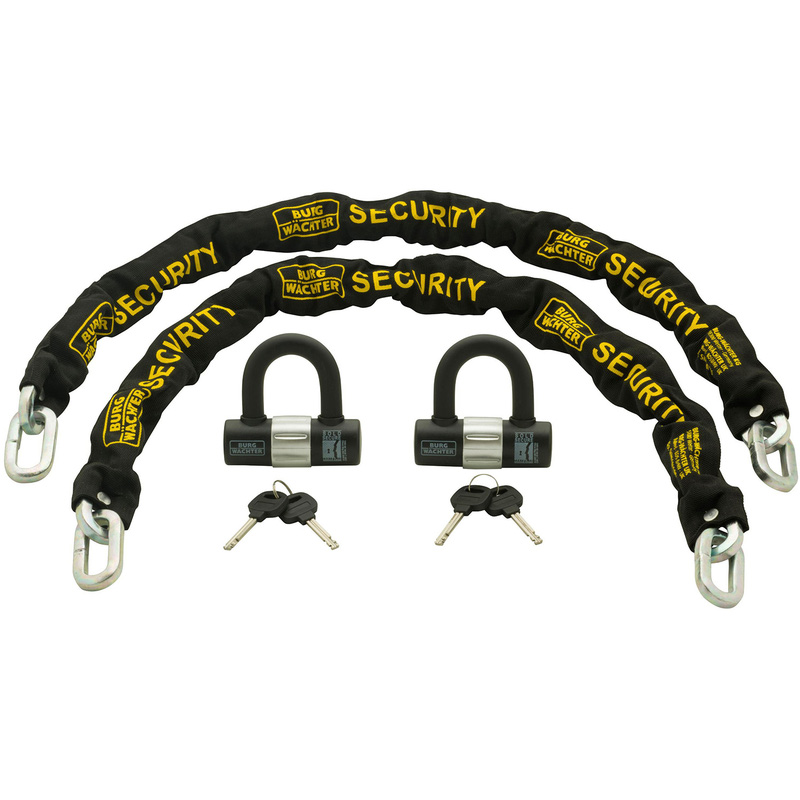 * The 2 chains are Hacksaw and bolt cropper resistant * Chain is Sold Secure bicycle diamond and motorcycle gold * U-lock has a protective rotating keyhole cover * U-lock is Sold Secure bicycle diamond motorcycle gold * U-lock has a hardened steel shackle and body for extra strength * Includes: 2 x 1m Chains & U-lock The Burg-Wächter 1m ?12mm duo chain & lock kit is independently tested by Sold Secure, additionally, the whole kit is Secured by Design; the official police initiative that works to improve security through effective product design. The entirety of this kit is weather resistant making it ideal for a wide array of uses. Furthermore, this high-security kit has everything you may need to secure your bicycle or any other valuables, offering peace of mind and protection from thieves. A high-strength solution for keeping bicycles and other valuables secure. This heavy-duty chain and lock set from Burg-Wächter gives you peace of mind that your belongings are well protected against thieves. The hardened steel square link chains come with a high-quality textile sleeve, riveted at each end to provide lasting protection against the weather. These 10mm chains are hacksaw and bolt-cropper resistant, and come in a 1m length. The set also includes two U-locks featuring a 16mm shackle and a strong disc locking mechanism within a hardened steel body – the perfect additional security measure for anything from motorcycles and mobility scooters to garden furniture, gates and sheds. * 10mm chain – hacksaw and bolt cropper-resistant * 1m chain length – secure bicycles and other valuables * Weather-resistant – peace of mind when used outdoors * Heavy-duty U-lock – strong double-bolted mechanism * Hardened steel shackle and body – 16mm shackle width * Protective key hole cover – rotates for easy access * Sold Secure rating – bicycle diamond and motorcycle gold * Twin pack – includes two chains and U-locks with keys | Burg-Wachter Heavy Duty Chain & U-Lock 1m (2 Pack) | Steel