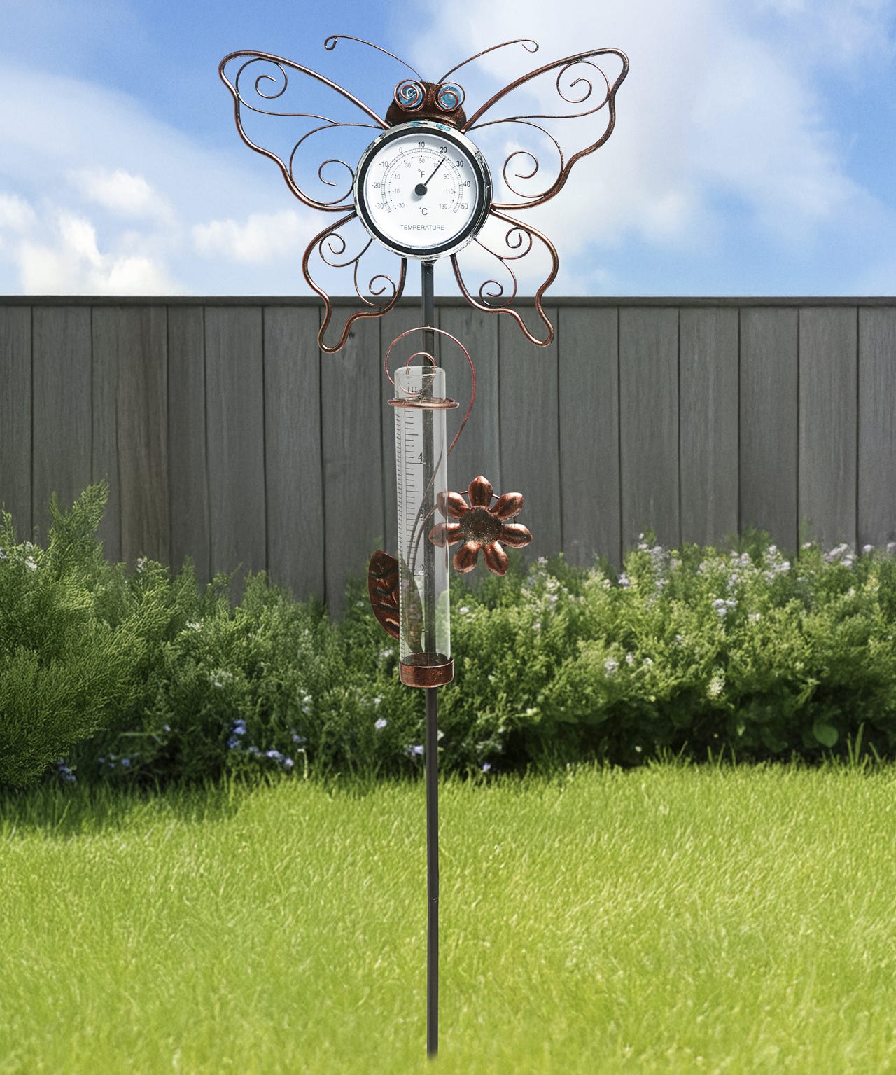 Keep track of the temperature and rainfall with our stylish butterfly weather station. Simply pushes into soft ground, so you can position it where you can best enjoy it. Includes a thermometer and rain gauge. Size: 18.5x80cm approx.