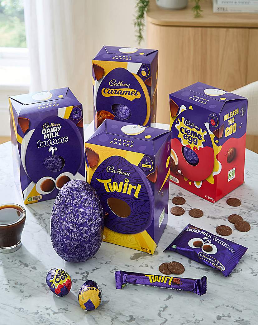 Bundle of four Cabury chocolate large Easter eggs. Perfect for sharing or enjoying all to yourself, this collection offers something for every chocolate lover this Easter. Contains: 1 x Cadbury Dairy Milk Giant Buttons Large Chocolate Egg 190g. 1 x Cadbury Dairy Milk Caramel Large Chocolate Egg 190g. 1 x Cadbury Twirl Large Chocolate Egg 171g. 1 x Cadbury Creme Egg Large Chocolate Egg 190g.