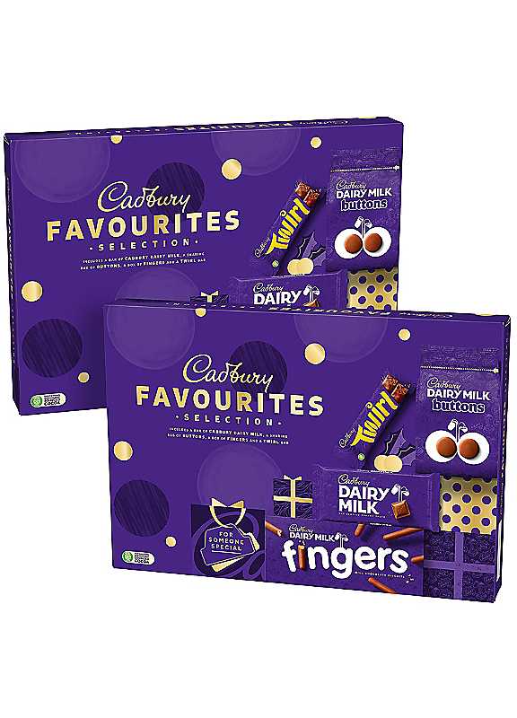 Cadbury Favourites Chocolate Selection Boxes Bundle of 2. Each Selection box contains a bar of Cadbury Dairy Milk, a sharing bag of buttons, a box of fingers and a Twirl bar. 2 x Cadbury Favourites Chocolate Selection Box 351g Containing Cadbury Dairy Milk Chocolate Bar, Cadbury Dairy Milk Chocolate Giant Buttons Bag, Cadbury Dairy Milk Chocolate Fingers Box, & Cadbury Twirl BarFor ingredients information click here