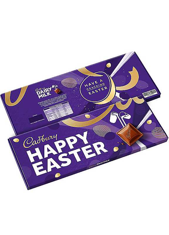The perfect Easter Gift for Chocoholics! Contains: 1 x Cadbury Dairy Milk Chocolate Bar 850g with Happy Easter Sleeve Age suitability: 3 to 5 years For ingredients information click here