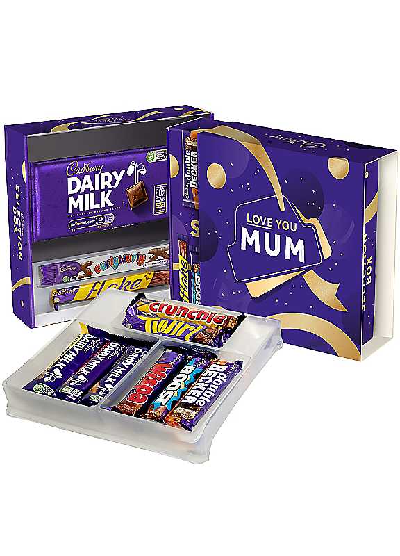 Cadbury Love You Mum Selection Box. A yummy variety of full sized Cadbury bars in a double layered selection box with a ' Love You Mum ' gift sleeve. Cadbury Love You Mum Selection box 524.5g which includes:1 x Cadbury Dairy Milk Chocolate Bar 110g1 x Cadbury Dairy Milk Chocolate Bar 45g1x Cadbury Dairy Milk Chocolate with Caramel Bar 45g1 x Cadbury Dairy Milk Chocolate Fruit & Nut Bar 49g1 x Cadbury Crunchie Chocolate Bar 40g1 x Cadbury Twirl Chocolate Bar 43g1 x Cadbury Flake Chocolate Bar 32g1 x Cadbury Curly Wurly Chocolate Bar 21.5g1 x Cadbury Wispa Chocolate Bar 36g1 x Cadbury Boost Chocolate Bar 48.5g1 x Cadbury Double Decker Chocolate Bar 54.5gFor ingredients information click here