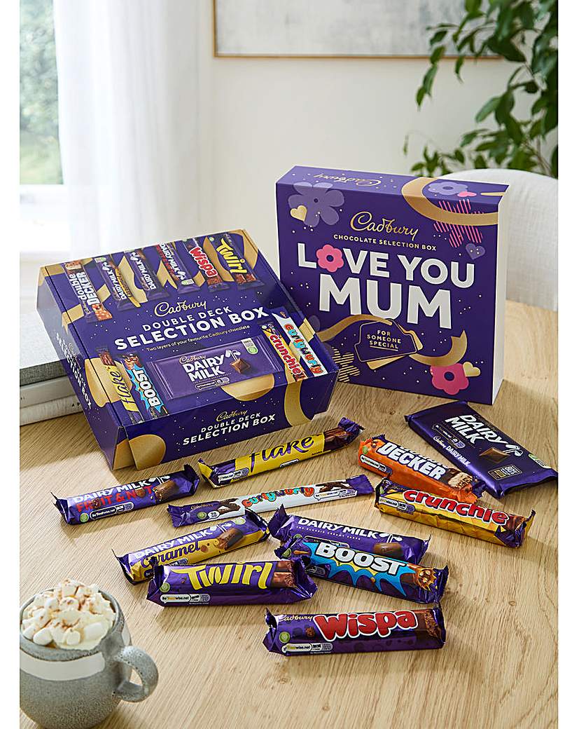 Cadbury 'Love You Mum' Chocolate Selection Box. A delicious selection of eleven full sized Cadbury bars in a double layered selection box with a 'I Love You' gift sleeve. Contains: 1 x Cadbury Dairy Milk Chocolate Bar 110g. 1 x Cadbury Dairy Milk Chocolate 45g. 1 x Cadbury Diary Milk Caramel Bar 45g. 1 x Cadbury Dairy Milk Fruit & Nut Bar 49g. 1 x Cadbury Crunchie Bar 40g. 1 x Cadbury Twirl Bar 43g. 1 x Cadbury Flake Bar 32g. 1 x Cadbury Curly Wurly Bar 21.5g. 1 x Cadbury Wispa Bar 36g. 1 x Cadbury Boost Bar 48.5g. 1 x Cadbury Double Decker Bar 54.5g.
