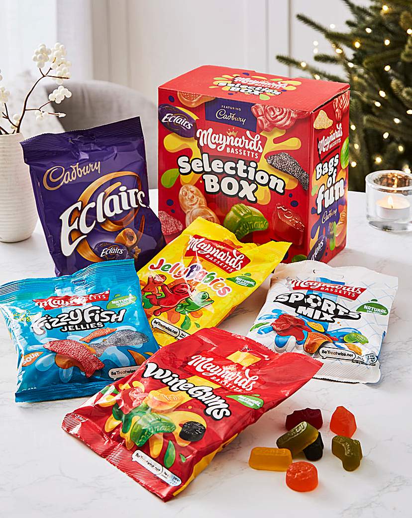 NEW for 2025 a Christmas sweet selection box. Bursting with a curated selection of your favourite sweets including Cadbury Eclairs and Maynards Bassetts sweet bags. Includes: 1 x Maynards Bassetts Jelly Babies Bag 130g. 1 x Maynards Bassetts Sports Mix Bag 130g. 1 x Maynards Bassetts Wine Gums Bag 130g. 1 x Maynards Bassetts Fizzy Fish 130g. 1 x Cadbury Eclairs Chocolate & Toffee Bag 130g. Please note we are unable to deliver this item ROI or Northern Ireland.