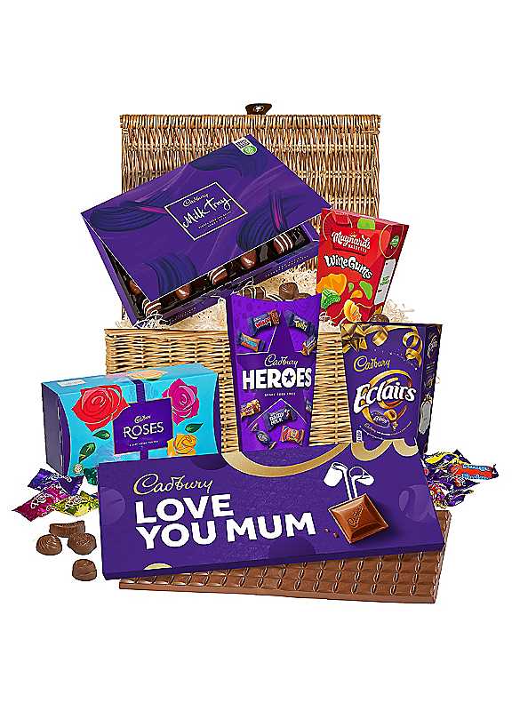 A beautifully presented 20 inch buff wicker hamper packed with a generous assortment of Cadbury favourites and classic sweets. Perfect for Mother's Day or special occasions, this indulgent hamper offers a mix of much-loved chocolates and sharing treats, all finished with a thoughtful 'Love You Mum' gift sleeve. 1x Cadbury Dairy Milk Chocolate Bar 850g with Love You Mum Gift Sleeve 1 x 445g Cadbury Milk Tray double layered chocolate box 1 x 275g Cadbury Roses Chocolate Carton 1 x 290g Cadbury Heroes Chocolate Box 1 x 350g Cadbury Chocolate Eclairs Carton 1 x Maynard's Bassett's Wine Gums Carton 350g For ingredients information click here