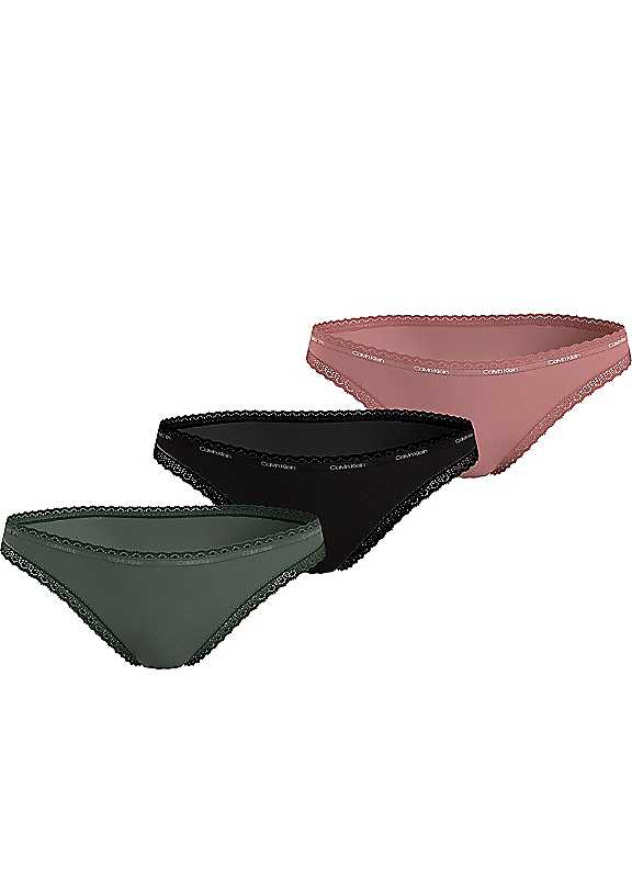Introducing the Calvin Klein Pack of 3 Bikini Briefs, the perfect addition to your lingerie collection. These Womens Bikini Bottoms come in a convenient Multipack, providing you with three comfortable and stylish options. Made with a body-hugging fit, these briefs offer a flattering silhouette while the lace edges add a touch of femininity. The iconic CK logo lettering on the waistband adds a subtle yet sophisticated detail. Say goodbye to uncomfortable underwear and hello to the ultimate combination of style and comfort with the Calvin Klein Pack of 3 Bikini Briefs.Brand: Calvin KleinMachine wash85% Polyamide, 15% Elastane | lace women briefs, lace brief panties, lace bikini briefs, lace panty brief, logo waistband panties, black lace briefs