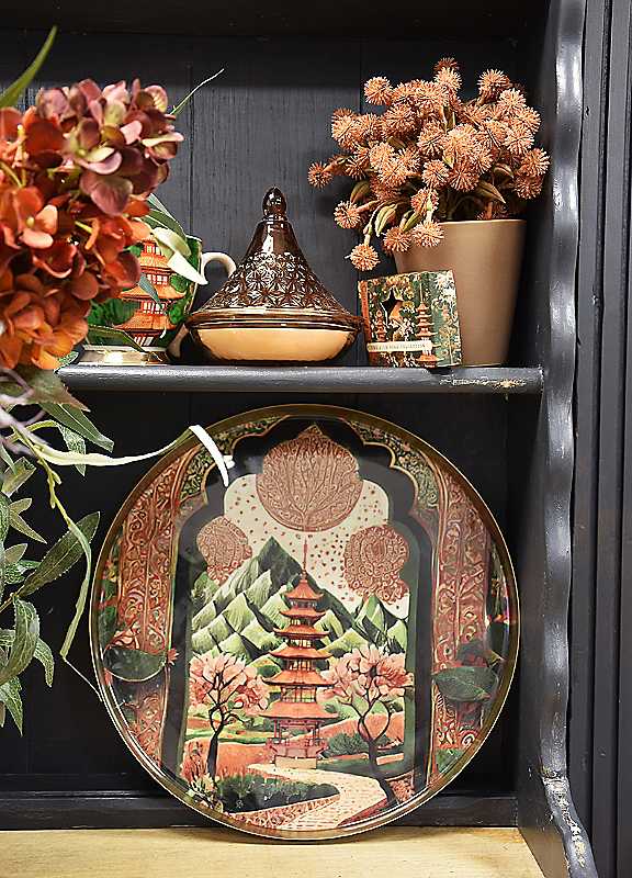 Enliven your decor with the vibrant artistry of the Samarkand Metal Tray from The Silk Road Collection. Featuring a mesmerising, richly coloured design inspired by traditional Eastern architecture and lush landscapes, this round metal tray combines practicality with artistic flair. The high-quality metal frame is finished in a warm antique gold tone, perfectly complementing the intricate scene of blooming cherry blossoms, a serene pagoda, and ornate borders. Whether used for serving drinks or as a decorative centrepiece, this striking tray is sure to spark conversation and elevate your home's ambience with an exotic touch.Metal trayWarm Antique Gold toneHand finishedWipe clean onlyDimensions approx. 3 x 32 x 32 cmNot suitable for dishwasher or microwave use. Do not place near a heat source, as tray will become hot.