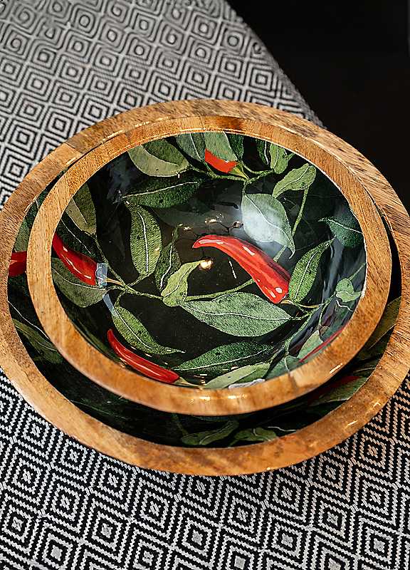 Spice up your serveware with this stunning 25cm mango wood bowl, featuring a vibrant chillies enamel inlay. Handcrafted from sustainable mango wood, each bowl showcases the natural beauty of the grain, paired with a bold and colourful interior that adds a playful, artistic flair to your table.Unique gift ideaHandcrafted, crafted & sustainableDo not hand wash, Wipe clean onlyDimensions approx. 7 x 25.5 x 25.5 cmNot suitable for dish washer or microwave use.This is a hand crafted item and some variation may occur.