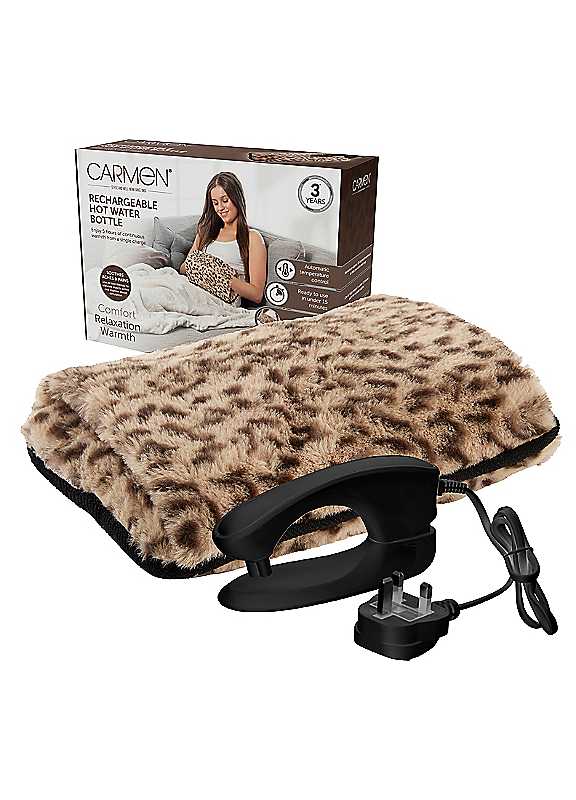 Make bedtime even cosier with this Rechargeable Hot Water Bottle from Carmen. Safe and simple to use, it comes pre-filled with water and permanently sealed so you never have to refill with boiling hot water or worry about leaking. Charging faster than a phone in under 15 minutes, it's almost instantly ready for overnight use and keeps the water warm while unplugged for up to 5 hours.It costs as little as 12p* to fully charge the Hot Water Bottle, keeping yourself warm and cozy, while you snuggle up on the sofa and save on expensive energy bills. The heat also has fantastic health benefits - not only keeping you warm in winter - it also helps soothe cramps, aches and pains, as well as improve blood circulation for longer-lasting comfort.Automatic temperature control provides the optimal amount of heat up to 70-75°C, while overheat protection ensures safe use. Designed using soft, comfy material and with a built-in pouch to keep your hands warm, this electric hot water bottle is made for a warmer, more comfortable night's sleep.*(Based off 24p per kWh)- SAFE HEATING SOLUTION - This rechargeable hot water bottle comes pre-filled with water already inside and permanently sealed so you never have to worry about refilling, leaks or scalding from boiling water- LONG-LASTING WARMTH - It heats up the water when powered on and unplugged to keep you warm in bed, retaining its temperature for up to 5 hours for long-lasting warmth and comfort overnight- ENERGY EFFICIENT - It costs as little as 12p to fully charge the Hot Water Bottle* based on 24p per kWh. Keep yourself warm and cozy as you snuggle up on the sofa and save on expensive energy bills.- SUPER-FAST CHARGING - Comes with a fast charging adaptor that can fully charge the battery in under 15 minutes- AUTOMATIC TEMPERATURE CONTROL - Provides a no-fuss way to warm up with temperature controls that automatically maintain the perfect temperature, switching itself off after reaching approximately 70-75°C for safe use and long lasting warmth- SOOTHES ACHES & PAINS - Acts as a heating pad to improve your blood circulation and can be used to alleviate pains from cramps, as well as relieve joint or muscle aches. The soft fleece cover and hand warmer pouch provide luxurious softness against your skin and offer supreme comfort- THE PERFECT GIFT - Ideal as a gift for a loved one or close friend as a reliable source of heat therapy or as a convenient and safe alternative to traditional hot water bottles- 3 YEAR GUARANTEE - Professional Carmen quality with a 1 year guarantee & optional 2 year extension, subject to product registration onlineDimensions approx. 17H x 24W x 7D cm