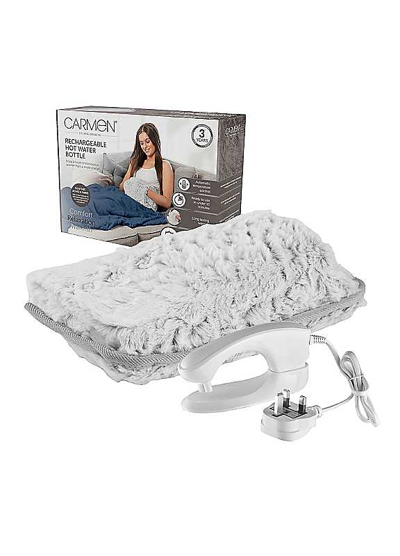 Make bedtime even cosier with this Rechargeable Hot Water Bottle from Carmen. Safe and simple to use, it comes pre-filled with water and permanently sealed so you never have to refill with boiling hot water or worry about leaking.Charging faster than a phone in under 15 minutes, it's almost instantly ready for overnight use and keeps the water warm while unplugged for up to 5 hours.It costs as little as 12p* to fully charge the Hot Water Bottle, keeping yourself warm and cozy, while you snuggle up on the sofa and save on expensive energy bills.The heat also has fantastic health benefits - not only keeping you warm in winter - it also helps soothe cramps, aches and pains, as well as improve blood circulation for longer-lasting comfort.Automatic temperature control provides the optimal amount of heat up to 70-75°C, while overheat protection ensures safe use.Designed using soft, comfy material and with a built-in pouch to keep your hands warm, this electric hot water bottle is made for a warmer, more comfortable night's sleep.*(Based off 24p per kWh)- SAFE HEATING SOLUTION - This rechargeable hot water bottle comes pre-filled with water already inside and permanently sealed so you never have to worry about refilling, leaks or scalding from boiling water- LONG-LASTING WARMTH - It heats up the water when powered on and unplugged to keep you warm in bed, retaining its temperature for up to 5 hours for long-lasting warmth and comfort overnight- ENERGY EFFICIENT - It costs as little as 12p to fully charge the Hot Water Bottle* based on 24p per kWh. Keep yourself warm and cozy as you snuggle up on the sofa and save on expensive energy bills.- SUPER-FAST CHARGING - Comes with a fast charging adaptor that can fully charge the battery in under 15 minutes- AUTOMATIC TEMPERATURE CONTROL - Provides a no-fuss way to warm up with temperature controls that automatically maintain the perfect temperature, switching itself off after reaching approximately 70-75°C for safe use and long lasting warmth- SOOTHES ACHES & PAINS - Acts as a heating pad to improve your blood circulation and can be used to alleviate pains from cramps, as well as relieve joint or muscle aches. The soft fleece cover and hand warmer pouch provide luxurious softness against your skin and offer supreme comfort- THE PERFECT GIFT - Ideal as a gift for a loved one or close friend as a reliable source of heat therapy or as a convenient and safe alternative to traditional hot water bottles- 3 YEAR GUARANTEE - Professional Carmen quality with a 1 year guarantee & optional 2 year extension, subject to product registration onlineDimensions approx. 17H x 24W x 7D cm