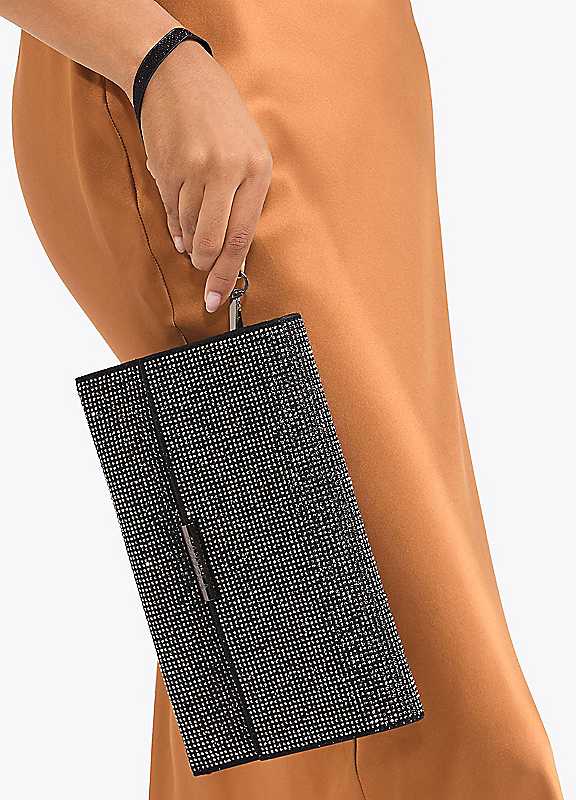 This caterina clutch bag arrives in black with a crystal embellishment. There is a chic gunmetal carvela branded plate on the flap closure.Removable cross body strapRemovable wrist strapMagnetic snap closureTwo interior compartmentsSyntheticSize approx. 16H x 26L x 2D cmStrap length: 112 cm