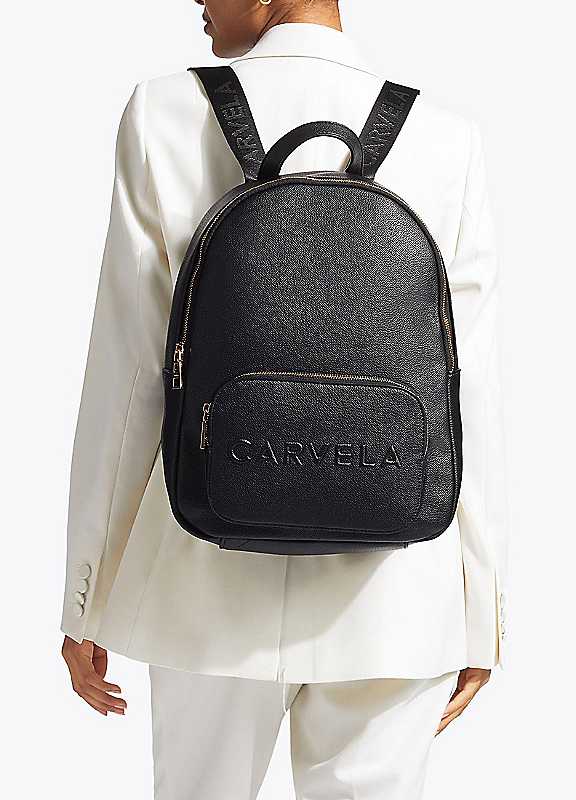 This frame backpack features a textured black exterior. There is a front zipped pocket with embossed branding.Adjustable shoulder strapsInterior lining pocketCan fit phones up to 7 inchesSyntheticSize approx. 36H x 28L x 12D cmStrap length: 102 cm