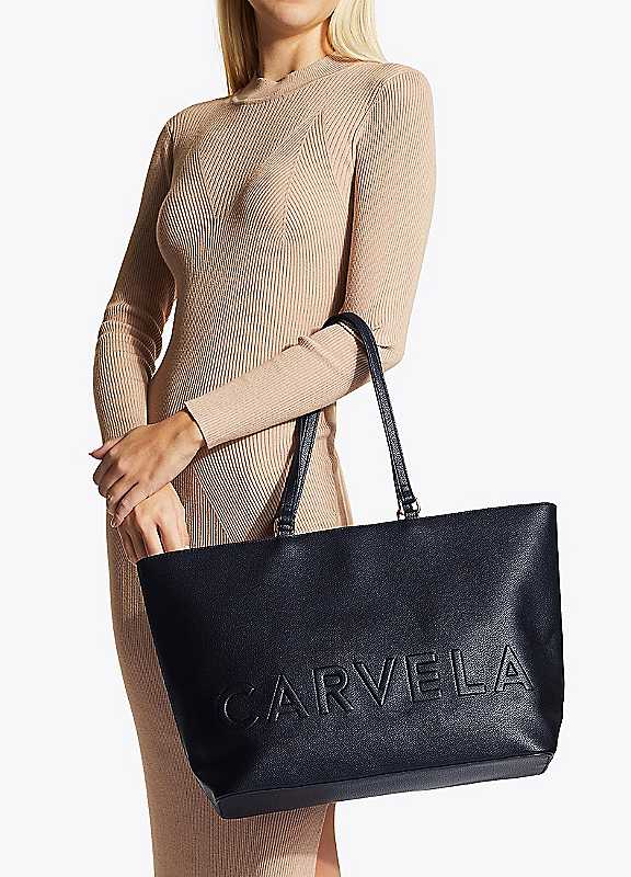 The frame winged shopper is crafted with a softly textured leather alternative upper in black. The front features a debossed carvela logo.Detachable pouch for secure itemsZip closureCan fit laptops up to 14 inchesInternal lining pocketMonogrammed interior liningSyntheticSize approx. 30H x 39L x 14D cmStrap drop shoulder: 56 cm